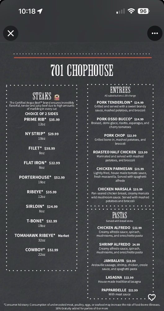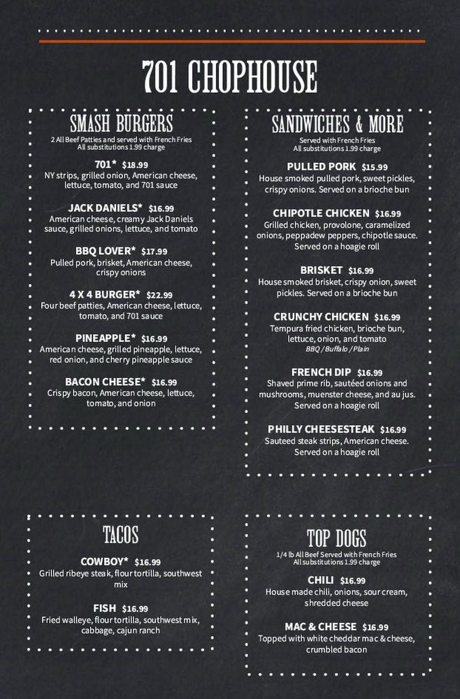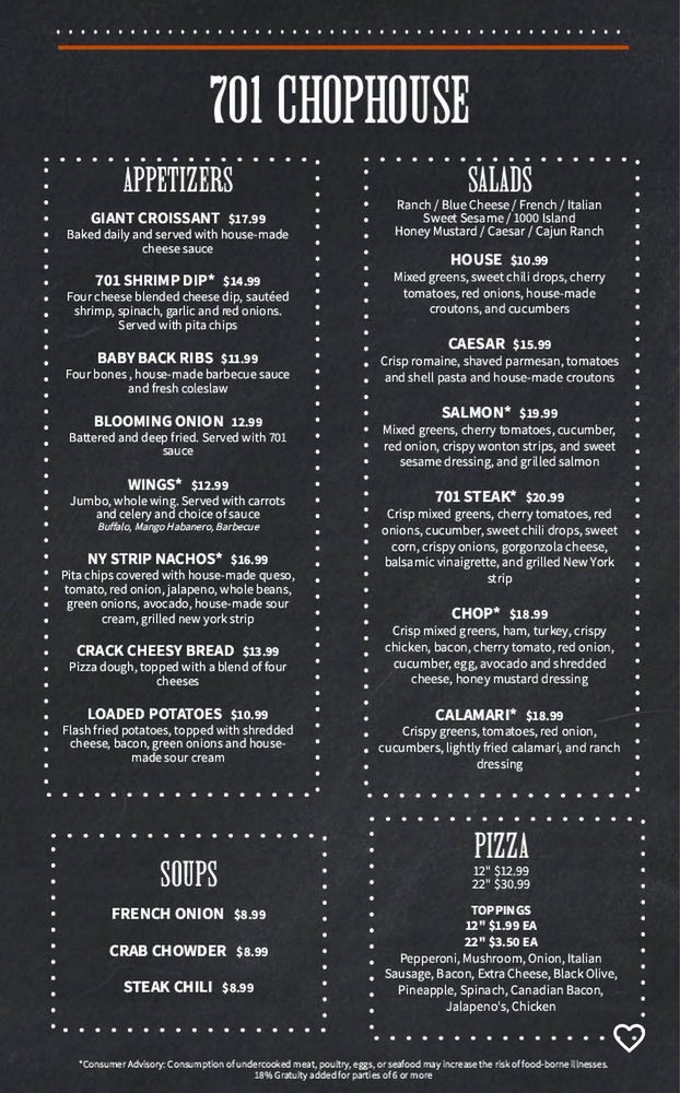 701 Chophouse Menu